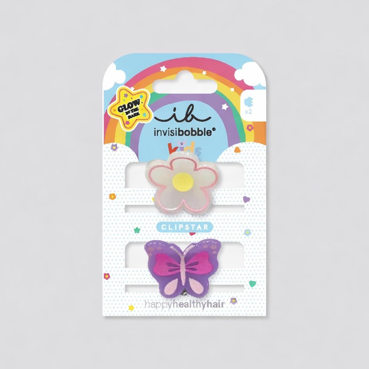 Invisibobble Clipstar Glow Kids Happy Flower – tai unikalūs ir žaismingi plaukų segtukai, kurie šviečia tamsoje. Jie suteikia spindesio bet kokiai šukuosenai ir puikiai tinka tiek kasdienai, tiek šventinėms akimirkoms. Neslystančios technologijos dėka segtukai tvirtai laikosi plaukuose, todėl užtikrinamas komfortas visą dieną. Rinkinyje rasite segtukus su gėlės ir drugelio motyvais.