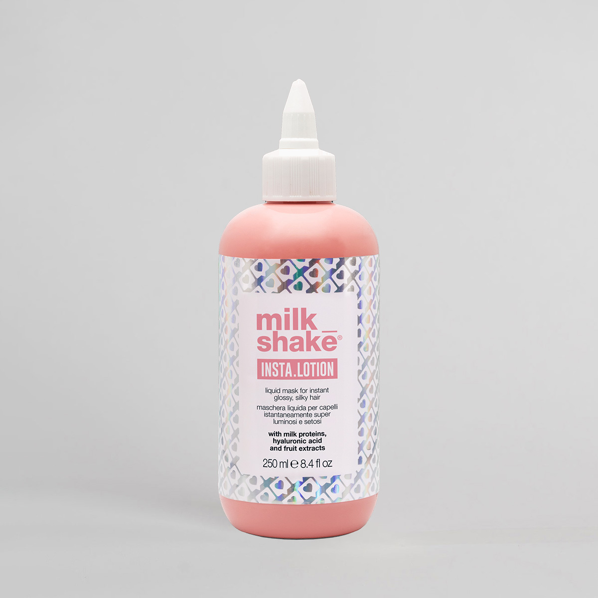 Milk Shake Insta Lotion – tai skysta glotninanti plaukų kaukė, kuri akimirksniu drėkina plaukus, suteikia žvilgesio, mažina šiaušimąsi. Dėl skystos konsistencijos kaukė yra lengvai paskirstoma ant plaukų.