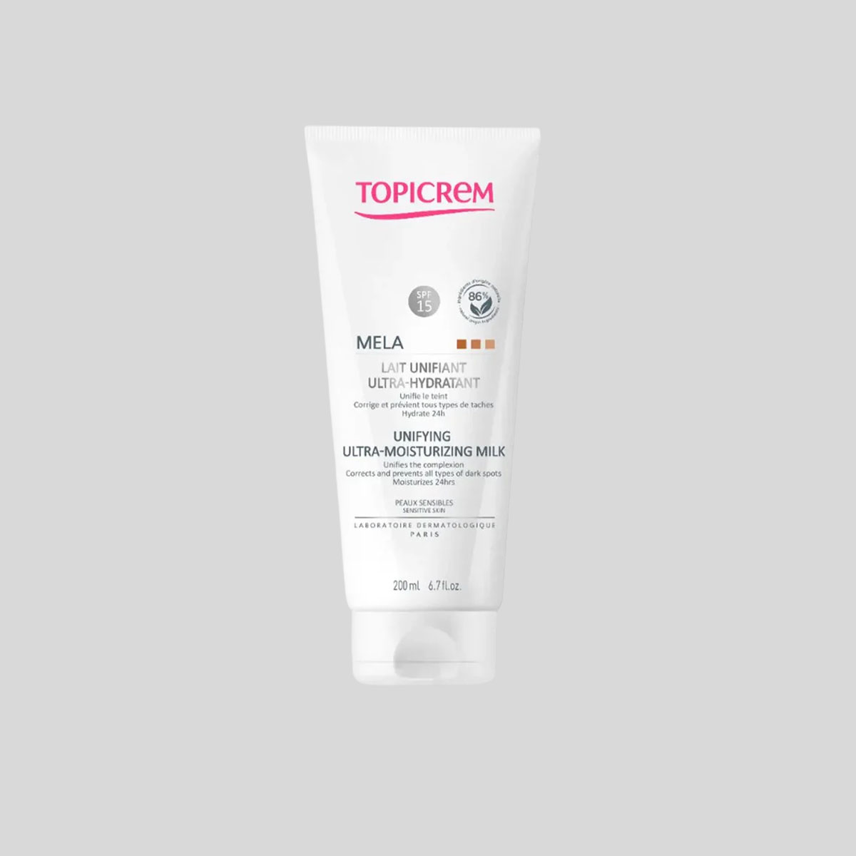Topicrem Mela Unifying drėkinamasis kūno pienelis intensyviai drėkina odą, suteikia skaistumo. Su apsauginiu filtru SPF 15. Lengva ir maloni tekstūra suteikia komforto pojūtį ir intensyvų drėkinimą.